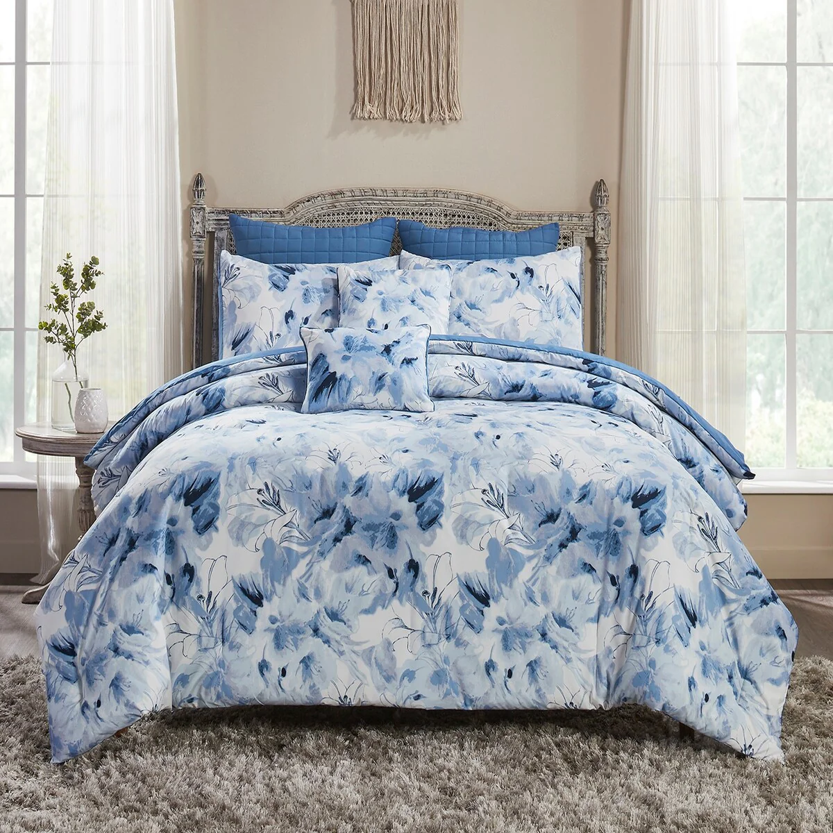 Better Trends Rosalia Collection 7-Piece Microfiber Floral Comforter Set in Blue - Soft, Durable & Machine Washable